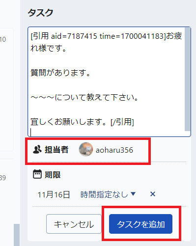 【担当者】の部分に私を選択頂き、期限の部分は触らずタスク追加をお願いします。