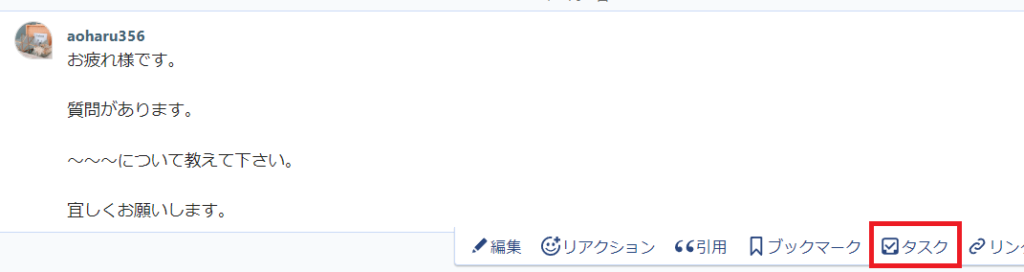 その後送信した質問の上にカーソルを合わせると、このように下にメニューが出てくるので【タスク】をクリックして下さい。